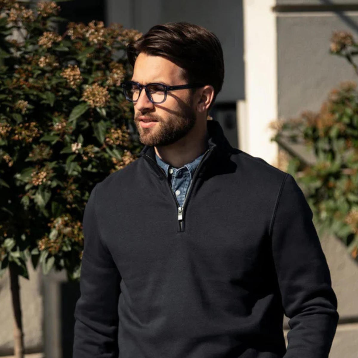 This versatile and current luxury sweatshirt is made in a comfy organic cotton-rich blend. The understated design with its ¼ zip funnel neck and elegant detailing makes it wearable on multiple occasions and allows for pairing with more formal wear. The brushed fleecy lining will make the luxurious feeling last. Available in black, navy and grey.